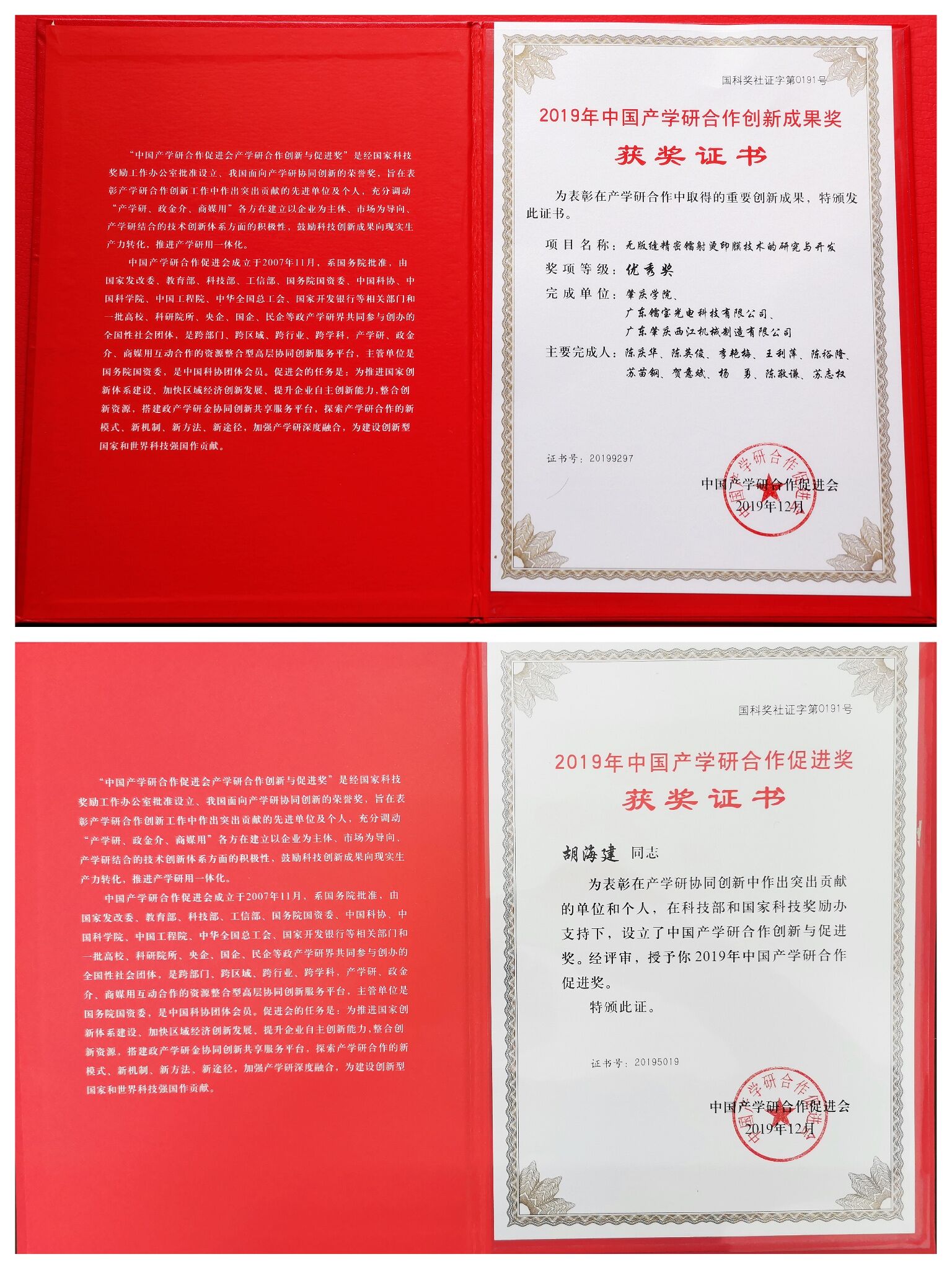我校胡海建教授获2019年中国产学研合作促进奖,我校陈庆华、陈英俊、李艳梅、王利萍、陈裕隆申报的项目“无版缝精密镭射烫印膜技术的研究与开发”获2019年中国产学研合作创新成果奖优秀奖(williamhill威廉希尔官网为申报单位,广东镭宝光电科技有限公司、广东省肇庆西江机械制造有限公司为合作完成单位),实现了学校在全国性产学研合作创新与促进奖上的零的突破,为申硕工作写下浓墨重彩的一笔。