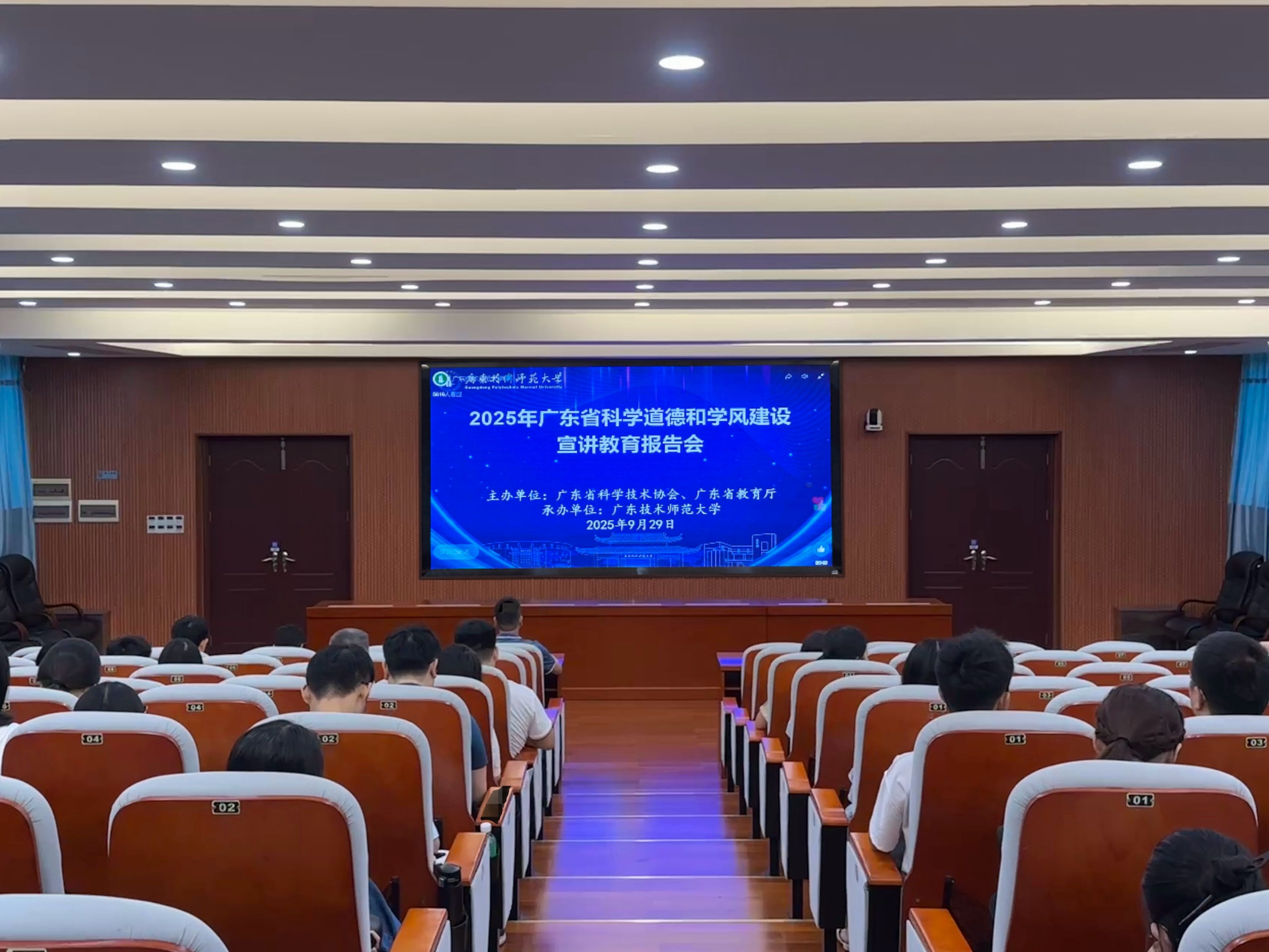 为深入学习贯彻习近平新时代中国特色社会主义思想与党的二十届三中全会精神,全面落实习近平总书记关于弘扬科学家精神和加强作风学风建设的重要指示精神,落实《全国科学道德和学风建设宣讲教育工作要点》要求,9 月 29 日上午,2025 年广东省科学道德和学风建设宣讲教育报告会在线上线下同步举行,我校组织师生在第二会议室集中观看报告会。