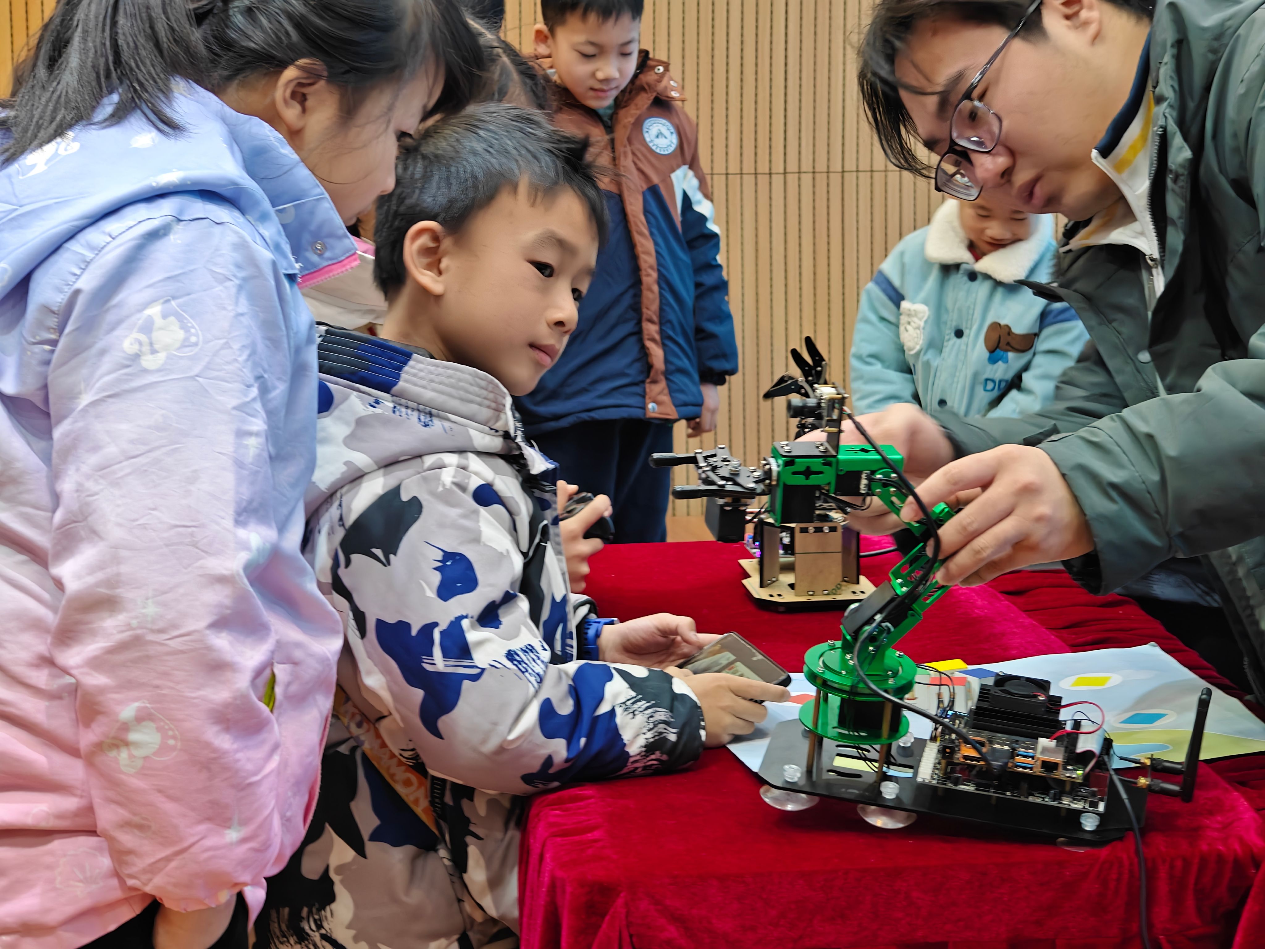 在总结往期活动经验基础上,团队创新打造“智能机器人剧场”:视觉人形机器人以灵动的舞蹈展现柔性运动控制技术,仿生机械手臂精准还原人类关节运动轨迹,AI视觉机械臂现场演示智能分拣系统,四足机械狗则以超强地形适应能力征服全场。特别引入的仿生蝴蝶成为最大亮点——搭载微型仿生扑翼系统的机械蝴蝶在会场翩然起舞,其精准的飞行姿态控制系统引发孩子们阵阵惊叹,生动诠释了人工智能技术的无限可能。